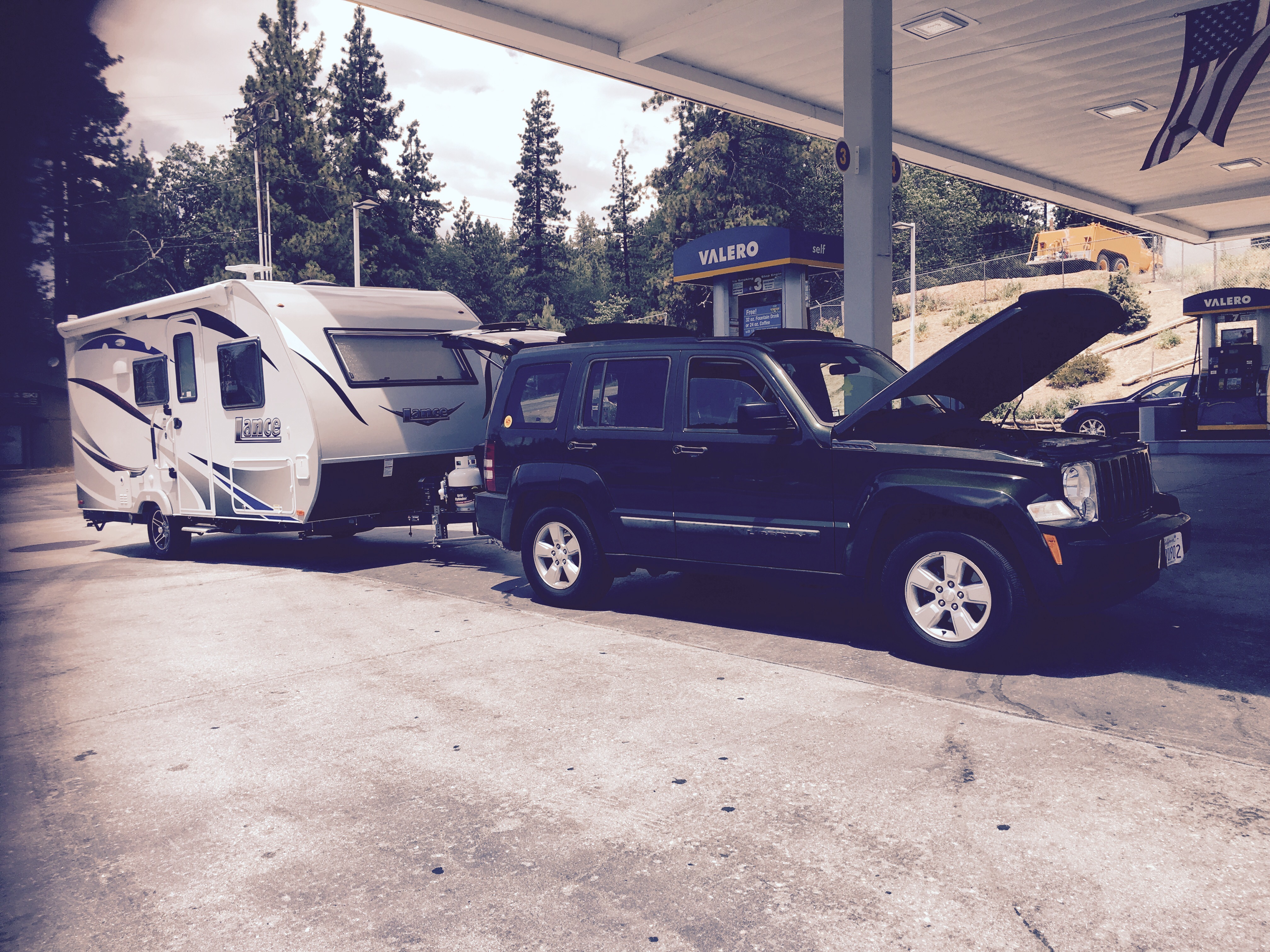 The drive up was a bit challenging. It’s hotter than 40 hells outside and we are climbing a mountain with a 3,000 pound camper attached to our jeep. We passed a sign warning motorist to turn off their air conditioner for the next 14 miles to avoid overheating. We immediately follow instructions. It’s hot outside, like the kind of heavy hot that crushes your lungs when you breathe in. We roll the windows down to at least get some air circulation. Did I mention that our tow/haul button is jammed? Well it is.