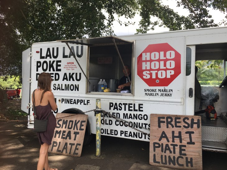 My favorite thing from our coastal food tour was the Holoholo Stop which is a food truck located in Kahalu'u with the gorgeous Kahalu'u stream as the backdrop.