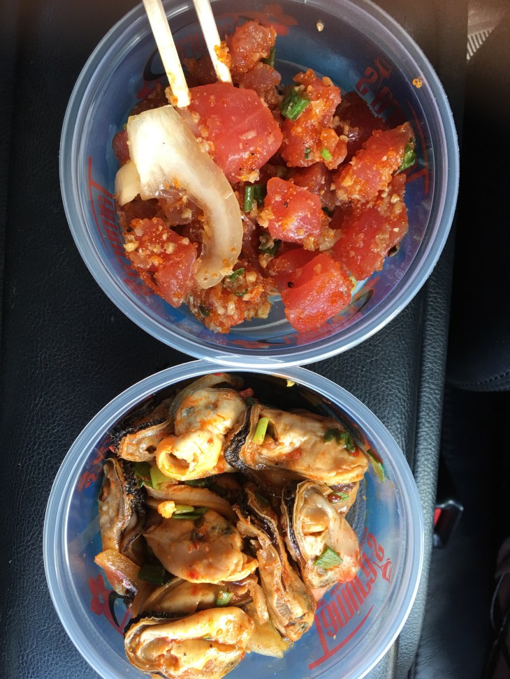 We hit up a couple of more food spots as well, including the local chain of Tamura's Market which has a huge selection of previously frozen ahi tuna poke, and it even had a delicious mussel poke. We also made a pit stop at a food truck lot kind of thing that is owned by Giovanni's shrimp truck. We shared some amazing Baja style corn on the cob, lemon butter shrimp with rice, and a fresh coconut to drink. After we finished the coconut they cut it half and scooped out the meat which we enjoyed on the beach.