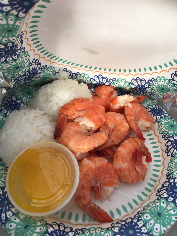 The famous plate lunch. Chicken Katsu for her, garlic shrimp for me. The plate lunch is served with rice and macaroni salad.